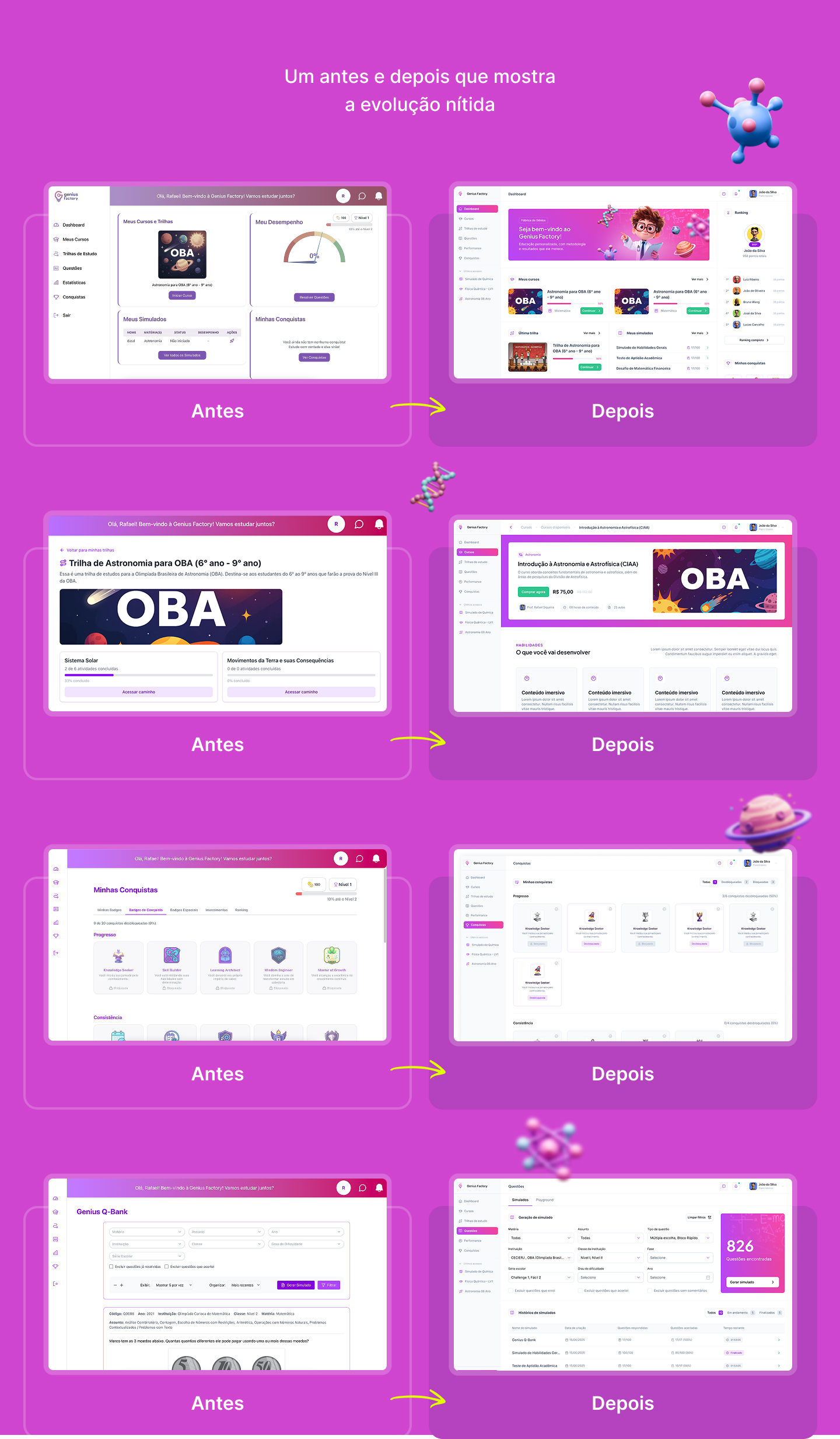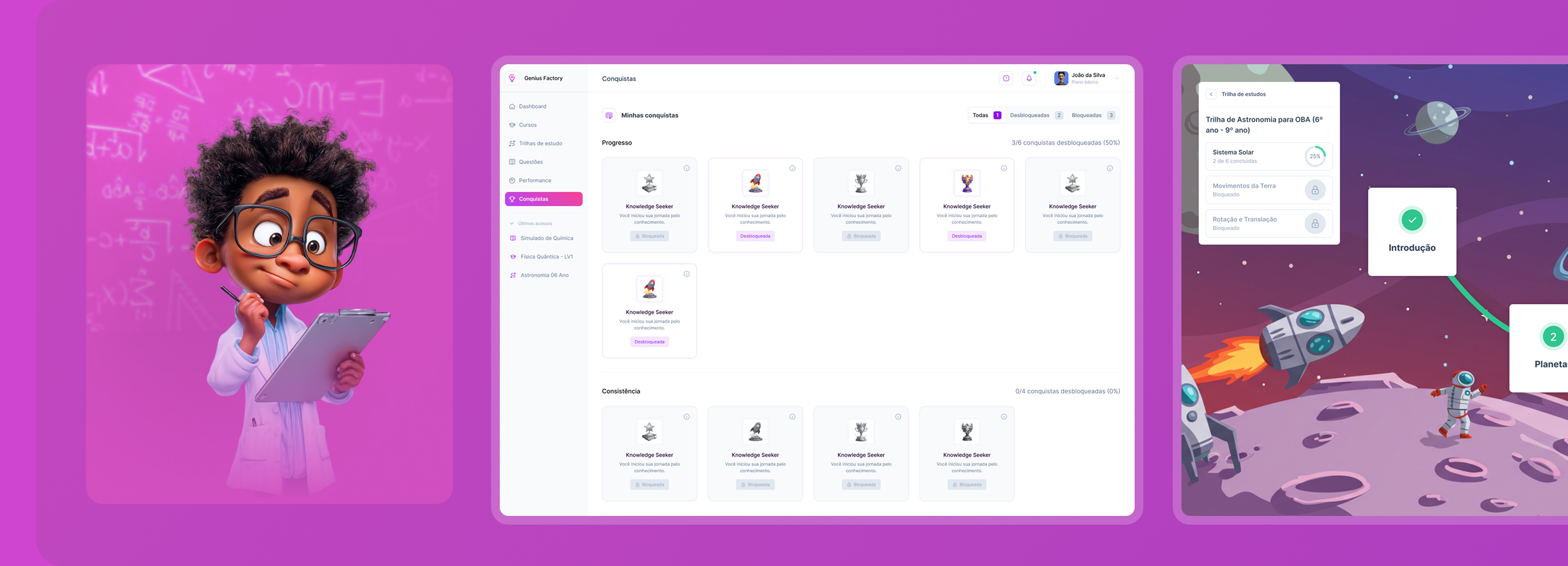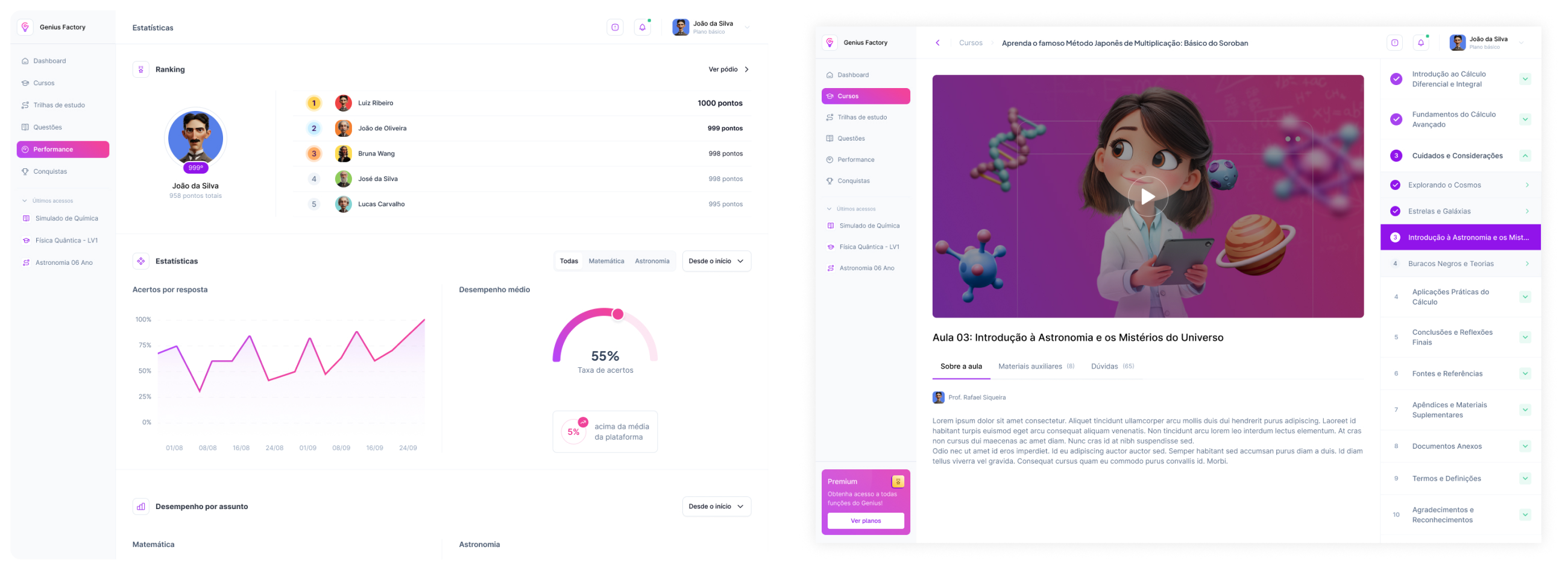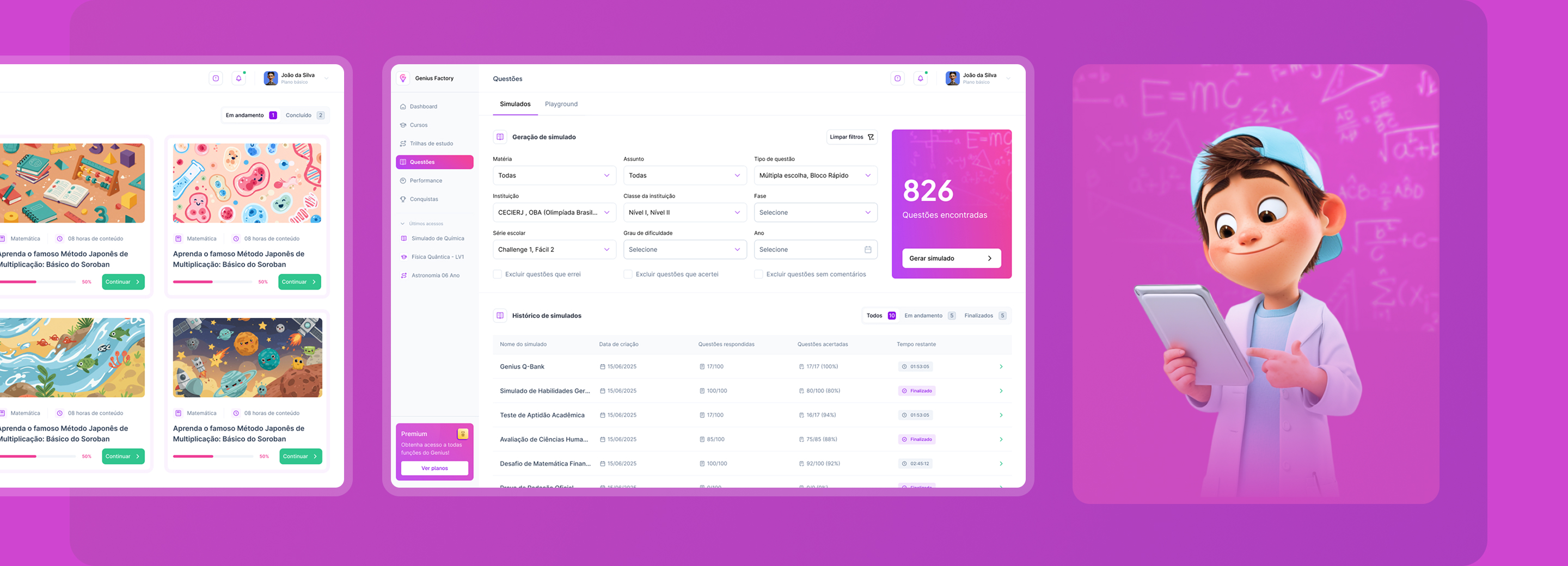 Cliente: Genius Factory Detalhe: Plataforma de ensino Serviços: UX, UI Tipo: Sistema