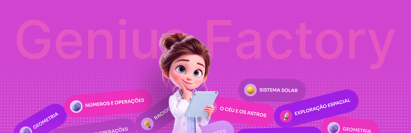 Genius Factory é uma plataforma de ensino online criado para impulsionar o aprendizado de crianças. Com uma interface prática e lúdica, a plataforma oferece cursos, trilhas personalizadas e ferramentas interativas que potencializam o aprendizado e guiam o usuário para uma nova forma de aprendizado.